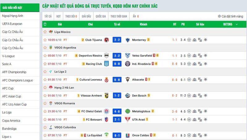 Một trong những điều khiến mình đánh giá cao bongdacom là độ phủ sóng “toàn cầu” của nó. Anh em có thể tìm thấy kqbd trực tuyến của mọi giải đấu – không chỉ các giải lớn như Ngoại hạng Anh, La Liga, Serie A, mà cả những giải nhỏ hơn như Hạng Nhất Việt Nam, K-League, J-League, hay thậm chí là các giải U23, U20.